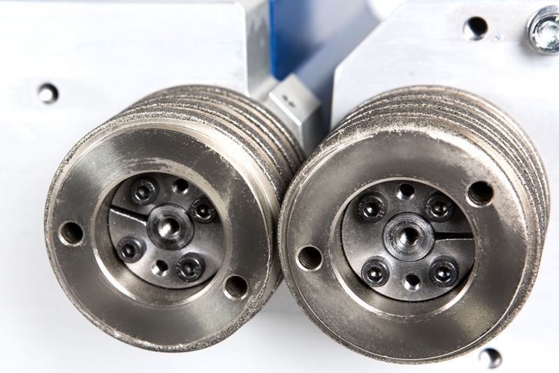 The structure supports 2 steel shafts placed horizontally and supported by bearings . The Small sharpening machine model it is provided by two helicoidal C.B.N.-coated wheels placed on the 2 shafts in order to sharpen knives . The knife sharpening wheels are penetrating and form a constant angle. The knife sharpening wheels turn upwards opposing each other so that they are opposed to the edge of the blade to be sharpened. An opening is located on the left side of the front structure for sharpening scissors .
